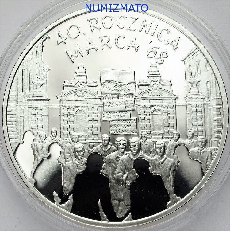 Srebrna moneta kolekcjonerska o nominale 10 zł wyemitowana przez NBP z okazji 40. rocznicy tzw. "wydarzeń marcowych".