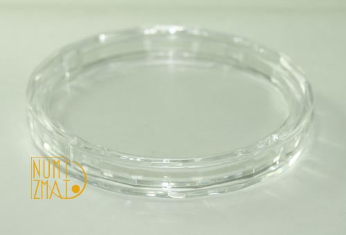 Wykonany z twardego przezroczystego tworzywa zakręcany kapsel z rantem na monety, numizmaty o średnicy do 70 mm.